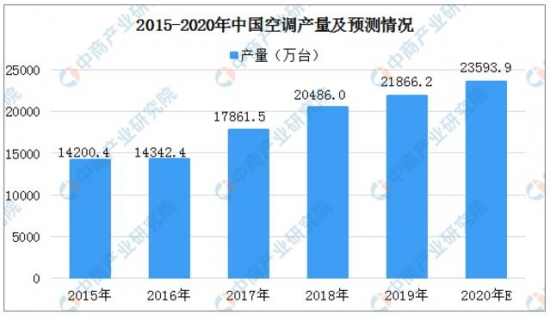 據(jù)國家統(tǒng)計局?jǐn)?shù)據(jù)顯示:2019年我國空調(diào)總產(chǎn)量為21866.2萬臺,相比2018年提升6.74%。據(jù)中商產(chǎn)業(yè)研究院預(yù)測,2020年我國空調(diào)總產(chǎn)量將達(dá)23593.9萬臺。